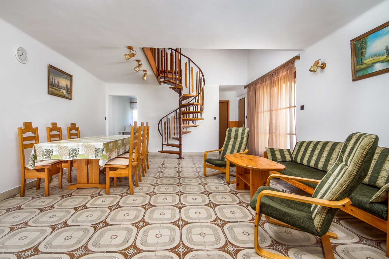 Földszint: Nappali étkezővel, konyha, fürdőszoba, zuhanyzó, WC, fedett terasz. Csigalépcső!