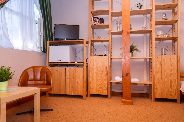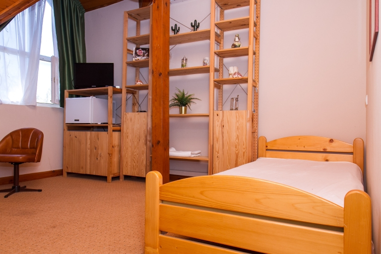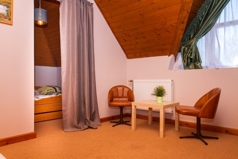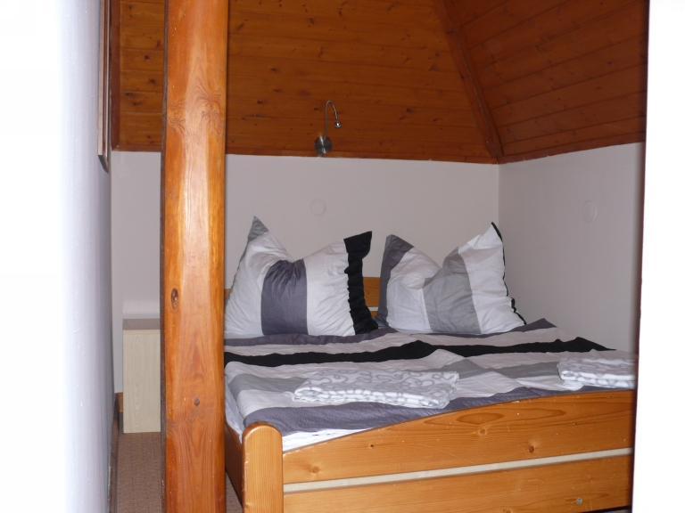 Emelet: Szoba egy fekhellyel, egy hálófülke 2 főre, zuhanyzó/WC, közös konyhahasználat, közös nappali étkezővel, mosógéphasználat.
